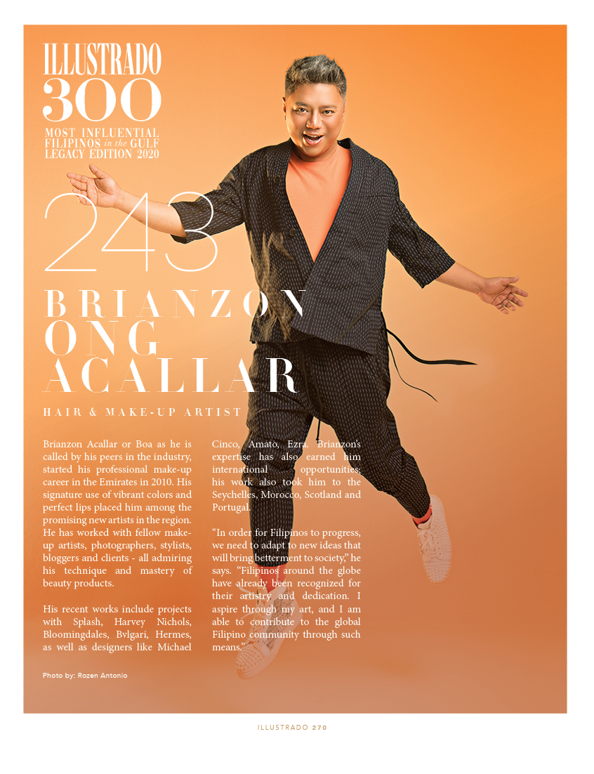 Brianzon Acallar or Boa as he is called by his peers in the industry, started his professional make-up career in the Emirates in 2010. His signature use of vibrant colors and perfect lips placed him among the promising new artists in the region. He has worked with fellow make-up artists, photographers, stylists, bloggers and clients – all admiring his technique and mastery of beauty products.