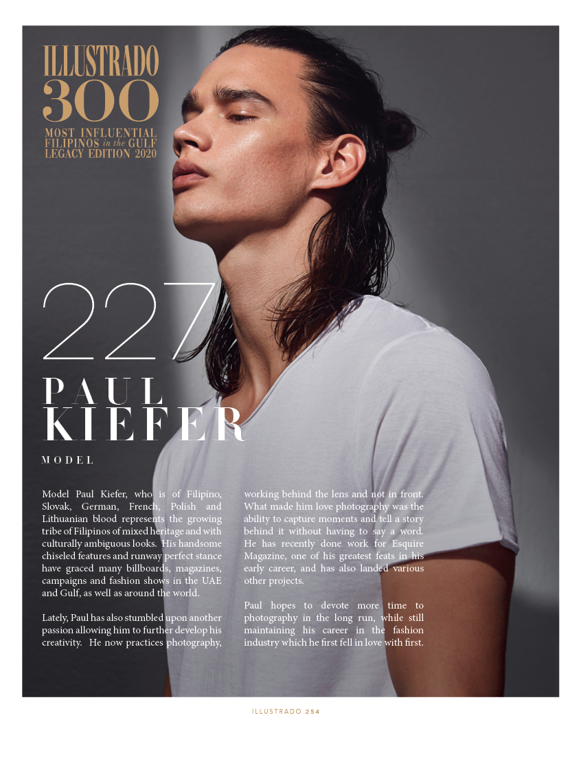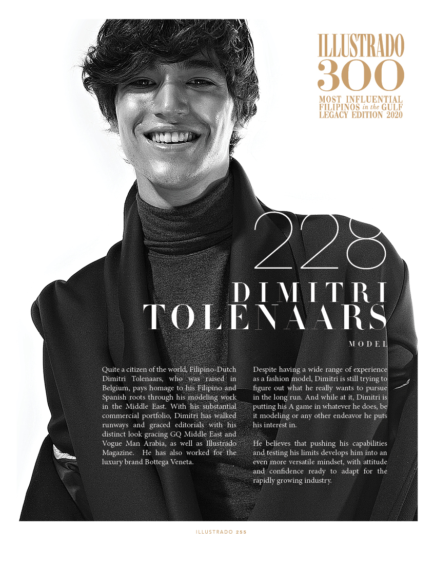 Quite a citizen of the world, Filipino-Dutch Dimitri Tolenaars, who was raised in Belgium, pays homage to his Filipino and Spanish roots through his modeling work in the Middle East. With his substantial commercial portfolio, Dimitri has walked runways and graced editorials with his distinct look gracing GQ Middle East and Vogue Man Arabia, as well as Illustrado Magazine. He has also worked for the luxury brand Bottega Veneta.