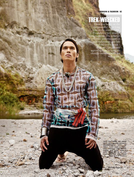 Pink tribal printed barong, carved wooden idol mask used as necklace, both by Tesoro’s; wooden choker and wooden bracelet, both by Tina Bonoan at Firma; silver coin ring and dried waterlily sandals, both by AC+632; leopard-printed shawl by Tango; corded belt by George Palmiano; dropped-crotch pants by Gerry Katigbak