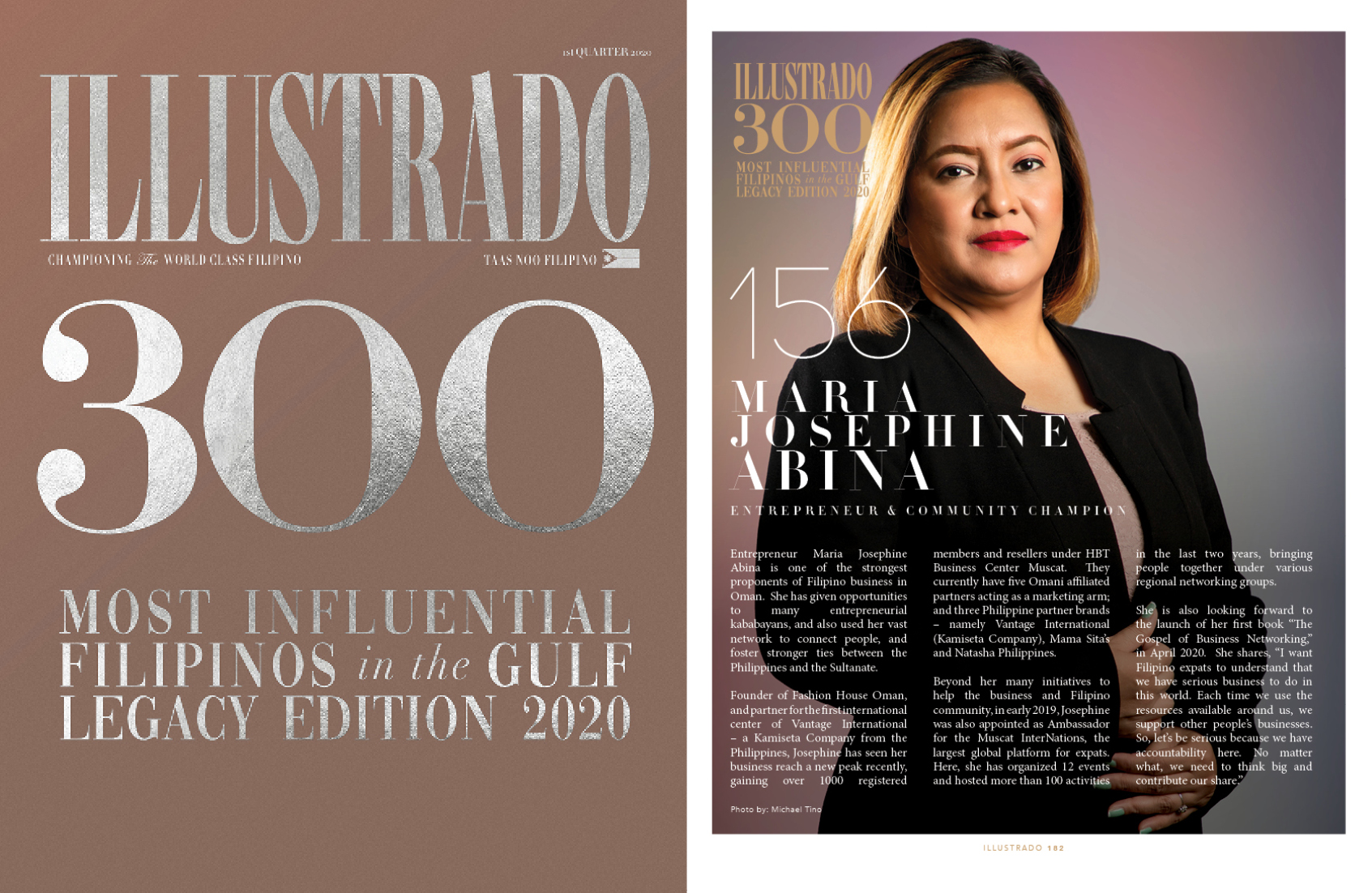 She is the Founder of Fashion House Oman, and partner for the first international center of Vantage International – a Kamiseta Company from the Philippines. Just recently, Maria Josephine has also been appointed distributor of Omani essential oils brand – OLIBAN. Using networking exceptionally as a vital business tool, she is also an active Consul of four groups including the Muscat Business Networking group at InterNations, one of the world’s largest international communities, where she has organized 75 activities in the previous year.