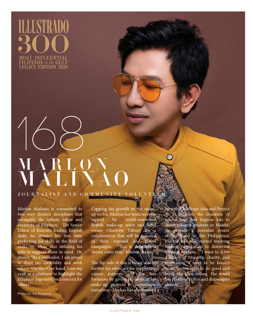 Marlon Malinao is committed to two very distinct disciplines that exemplify the infinite talent and creativity of Filipinos. The Senior Editor of Kuwait’s leading English daily, he devotes his free time perfecting his skills in the field of make-up, while also utilizing his gifts to support those in need. He shares, “As a journalist, I am proud to share my credibility and work ethics. On the other hand, I use my craft as a platform to highlight the Filipinos’ ingenuity and concern for others.”