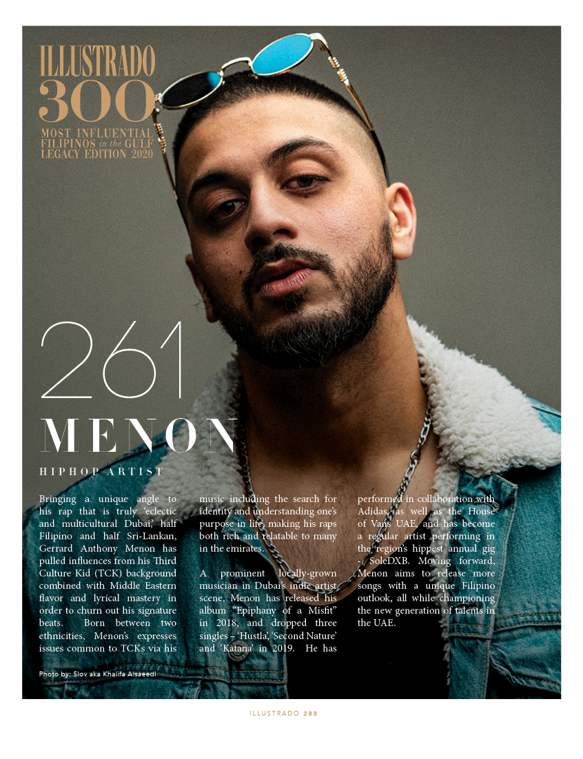 A prominent locally-grown musician in Dubai’s indie artist scene, Menon has released his album “Epiphany of a Misfit” in 2018, and dropped three singles – ‘Hustla’, ‘Second Nature’ and ‘Katana’ in 2019. He has performed in collaboration with Adidas, as well as the House of Vans UAE, and has become a regular artist performing in the region’s hippest annual gig – SoleDXB. Moving forward, Menon aims to release more songs with a unique Filipino outlook, all while championing the new generation of talents in the UAE.