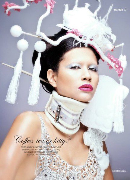 White Japanese-inspired headpiece ensemble and neckbrace by Amato Haute Couture; Swarovski crystallized brassier and necklace by Garimon Roferos