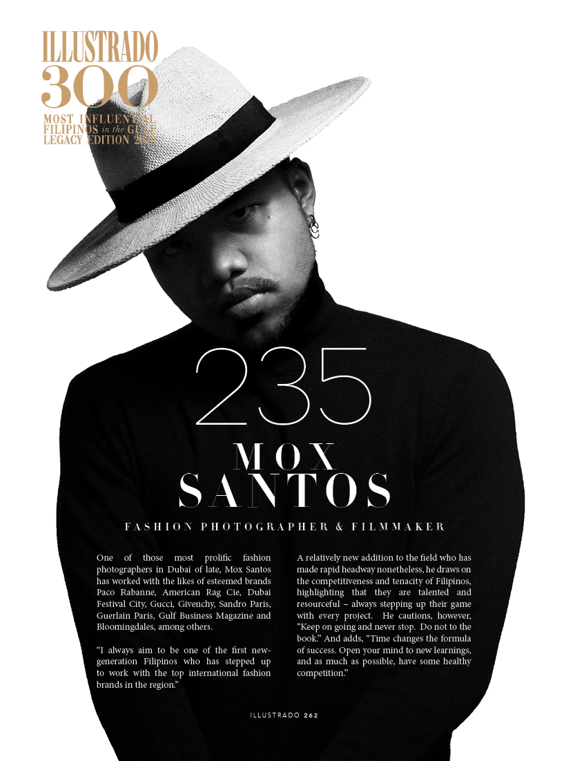 One of those most prolific fashion photographers in Dubai of late, Mox Santos has worked with the likes of esteemed brands Paco Rabanne, American Rag Cie, Dubai Festival City, Gucci, Givenchy, Sandro Paris, Guerlain Paris, Gulf Business Magazine and Bloomingdales, among others.