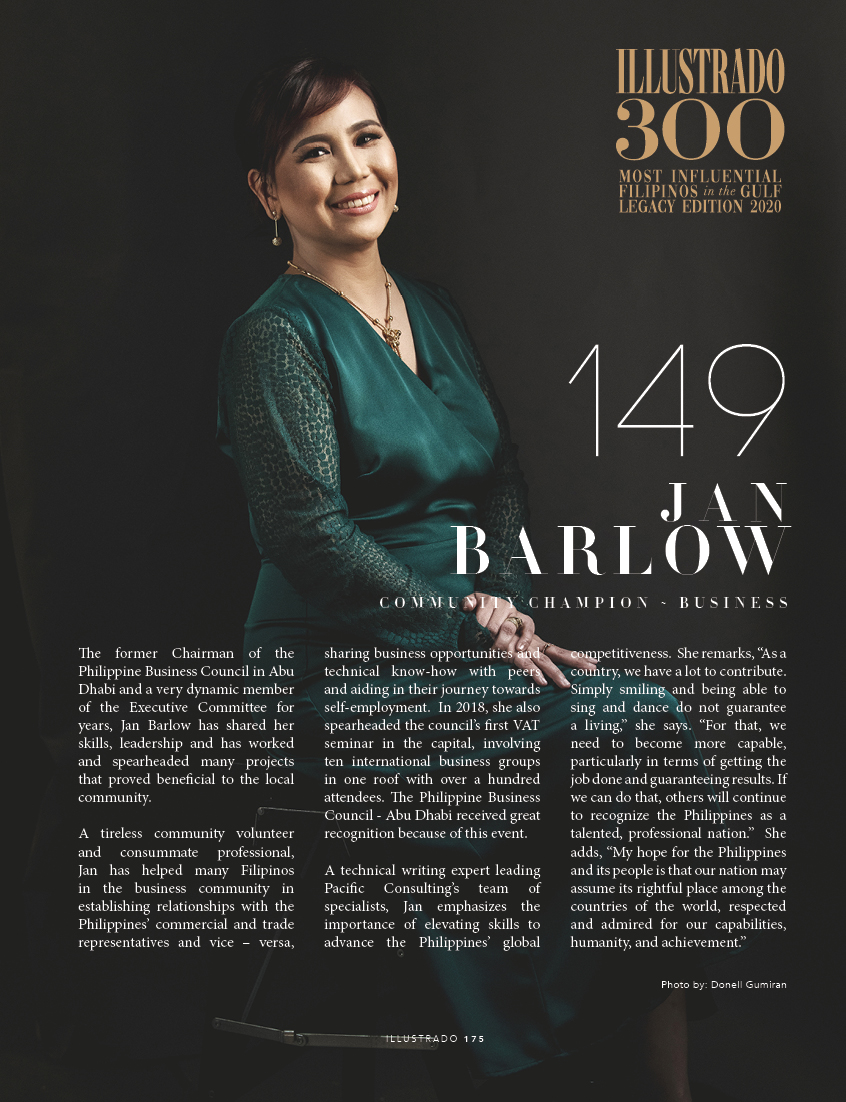 Thoughtleader – Jan Barlow Community Champion – Business The former Chairman of the Philippine Business Council in Abu Dhabi and a very dynamic member of the Executive Committee for years, Jan Barlow has shared her skills, leadership and has worked and spearheaded many projects that proved beneficial to the local community. A tireless community volunteer …