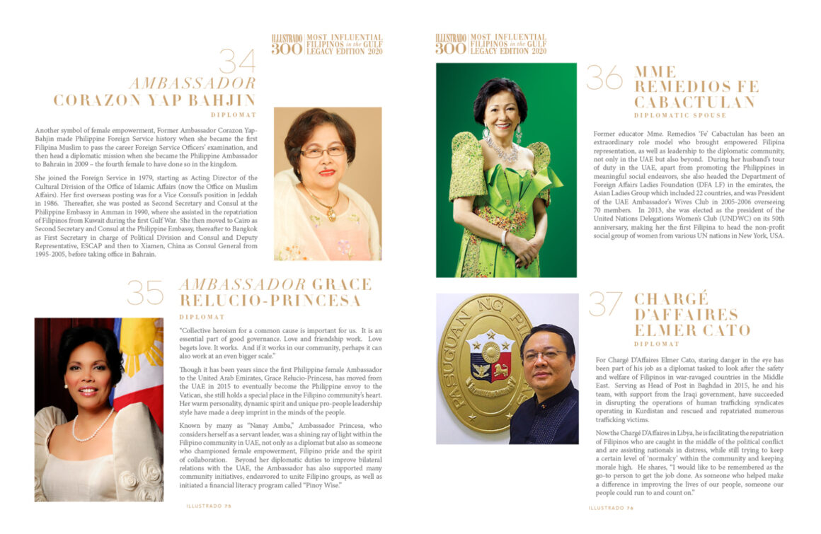 Ambassador Corazon Yap Bahjin Diplomat Another symbol of female empowerment, Former Ambassador Corazon Yap-Bahjin made Philippine Foreign Service history when she became the first Filipina Muslim to pass the career Foreign Service Officers’ examination, and then head a diplomatic mission when she became the Philippine Ambassador to Bahrain in 2009 – the fourth female …