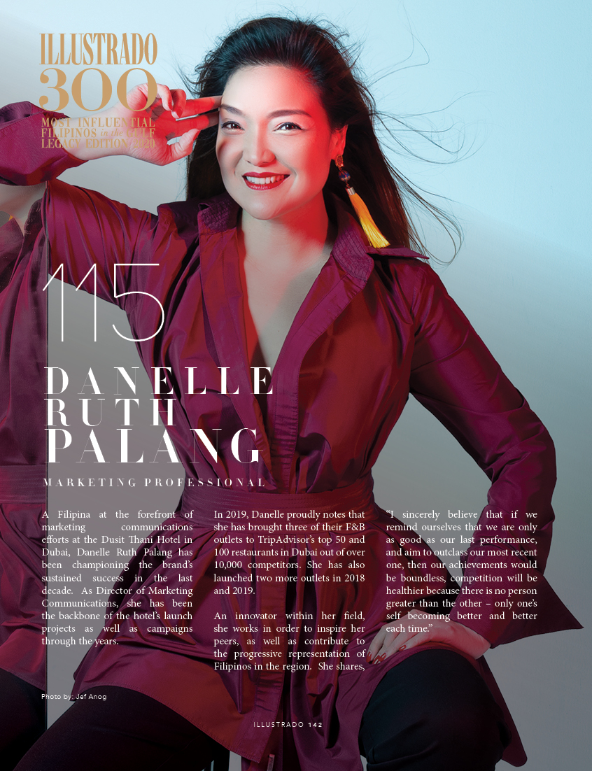 Danelle Ruth Palang is one of the most authoritative Filipino figures in the UAE’s MarComms scene, but you will never hear this from her. In fact, you will be hard-pressed to engage Danelle in any conversation about her many achievements, as she is decidedly, resolutely low profile. But amidst her stunning range of accomplishments and responsibilities, Danelle is most fond of her role as a mom. She says, “I am proud to know that my son understands and grasps the balance of struggling in life and working his way up. This beats any award, any day.”