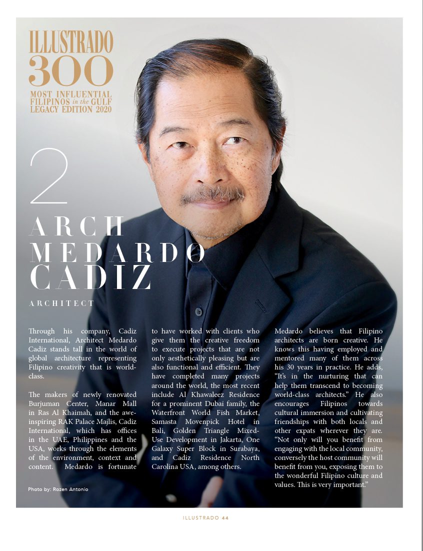 Albeit soft spoken, the critically acclaimed Medardo Cadiz stands among the UAE’s most prolific Architects – responsible for some of the most remarkable works of architecture in the region and abroad. Learn more about this inspiring individual here: #illustradomagazine #taasnoofilipino