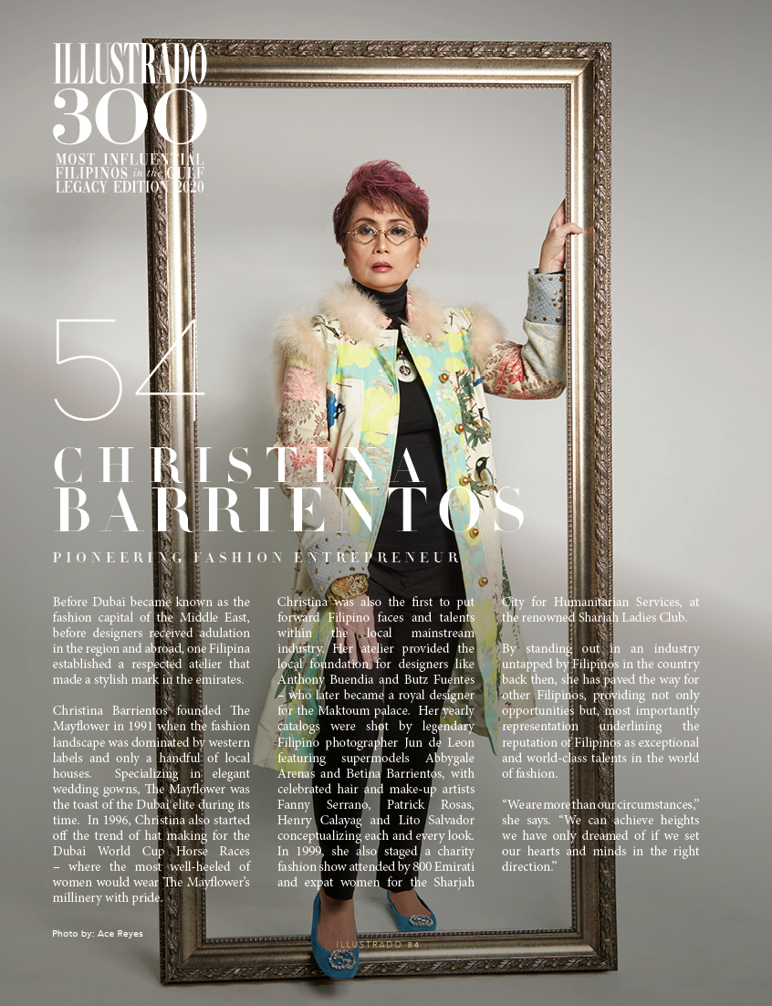 Legacy – Christina Barrientos Fashion Entrepreneur Before Dubai became known as the fashion capital of the Middle East, before designers received adulation in the region and abroad, one Filipina established a respected atelier that made a stylish mark in the emirates. Christina Barrientos founded The Mayflower in 1991 when the fashion landscape was dominated by …
