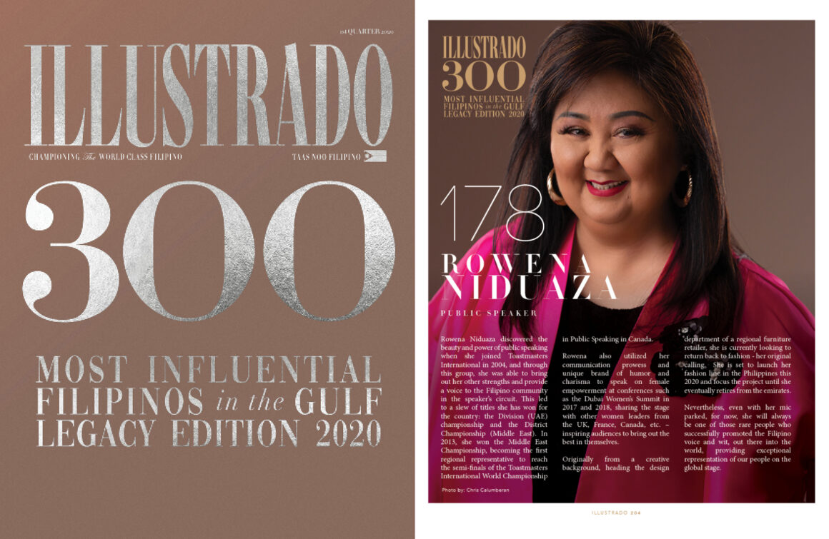 Rowena has gained the respect and admiration of the Filipino community in the UAE for her magnificent strides with Toastmasters International – a non-profit organization that conducts communication and leadership training worldwide.