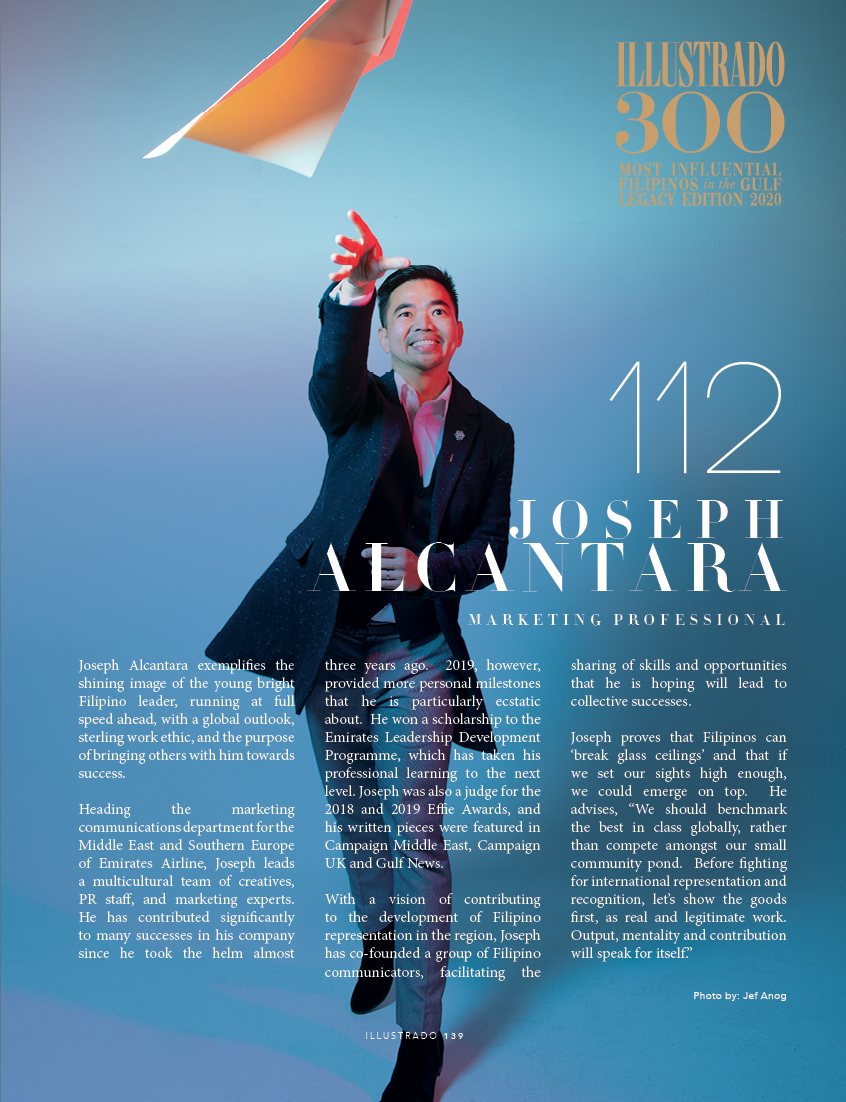 Thoughtleader – Joseph Alcantara Marketing Professional Joseph Alcantara exemplifies the shining image of the young bright Filipino leader, running at full speed ahead, with a global outlook, sterling work ethic, and the purpose of bringing others with him towards success. Heading the marketing communications department for the Middle East and Southern Europe of Emirates Airline, …