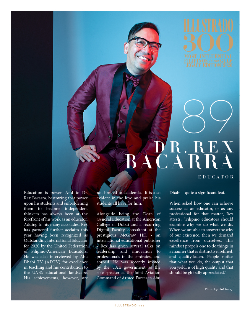 A cut above your average college professor, Rex Bacarra exemplifies the Filipinos’ ability to excel in an environment of diversity and ambition. A teacher of Philosophy and Humanities at the American College of Dubai, Rex considers his work – shaping the impressionable minds of today’s youth – as the acme of his life’s purpose. He articulates: “I encourage critical thinking among the ubiquitously multicultural young about the fundamental questions of life, its meaning, truth and falsehood, belief, and the nature of reality, knowledge and society.”