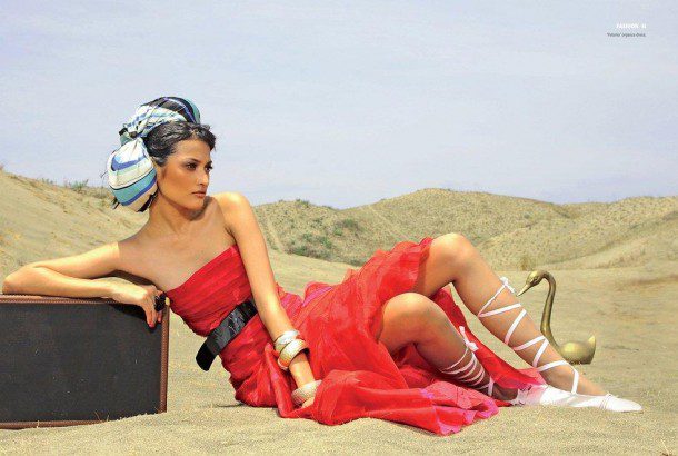 Here, the barren earth meets the endless blue sky and calm waters in one dramatic moment of silence providing perfect backdrop to smoldering frocks with nomadic inclinations.