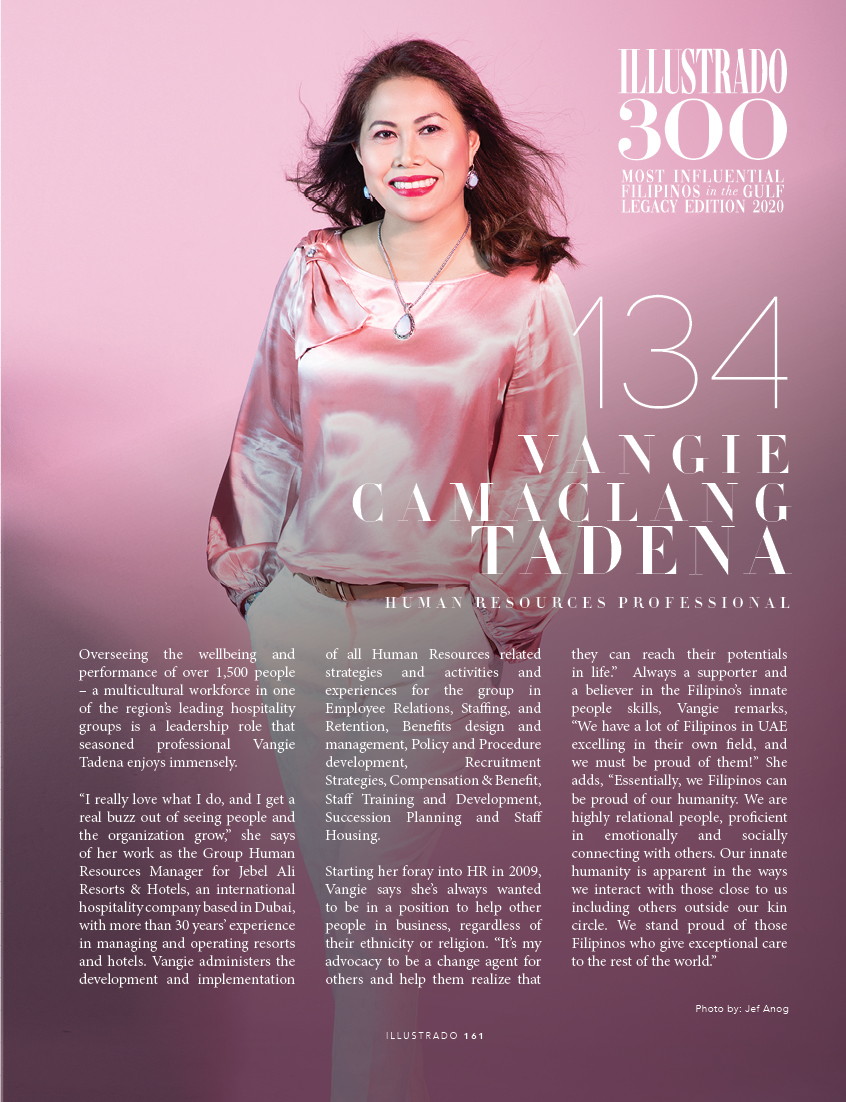 Starting her foray into HR in 2009, Vangie says she’s always wanted to be in a position to help other people in business, regardless of their ethnicity or religion. “It’s my advocacy to be a change agent for others and help them realize that they can reach their potentials in life.” Always a supporter and a believer in the Filipino’s innate people skills, Vangie remarks, “We have a lot of Filipinos in UAE excelling in their own field, and we must be proud of them!” She adds, “Essentially, we Filipinos can be proud of our humanity. We are highly relational people, proficient in emotionally and socially connecting with others. Our innate humanity is apparent in the ways we interact with those close to us including others outside our kin circle. We stand proud of those Filipinos who give exceptional care to the rest of the world.”